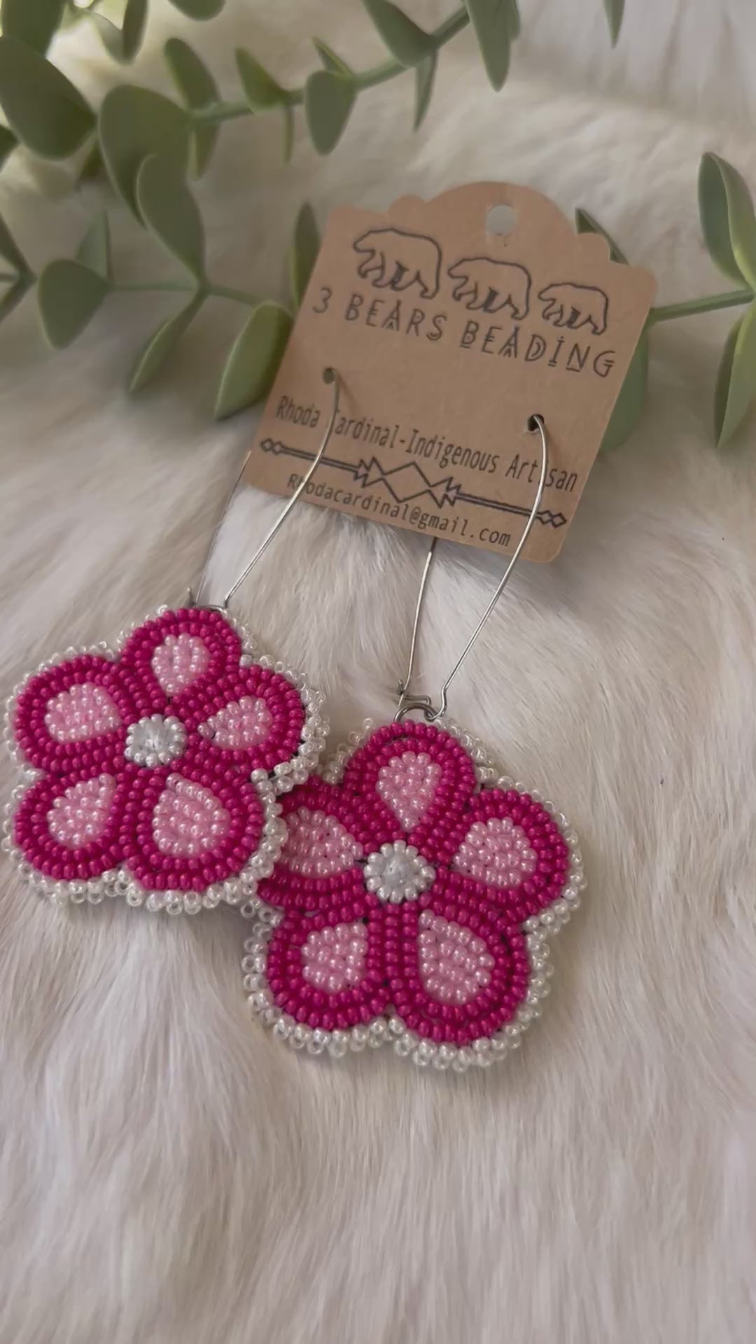 Authentic Indigenous pink floral beaded earrings designed with care and tradition. These beautiful earrings feature delicate beadwork arranged in a charming floral pattern, complemented by a gentle dangle that adds subtle movement. The backing is crafted from soft moose hide, ensuring comfort and durability. Measuring just over 2 inches, they are the perfect size to make a graceful statement while honoring Indigenous craftsmanship. Wear them to celebrate cultural artistry and add a touch of elegance to any outfit.