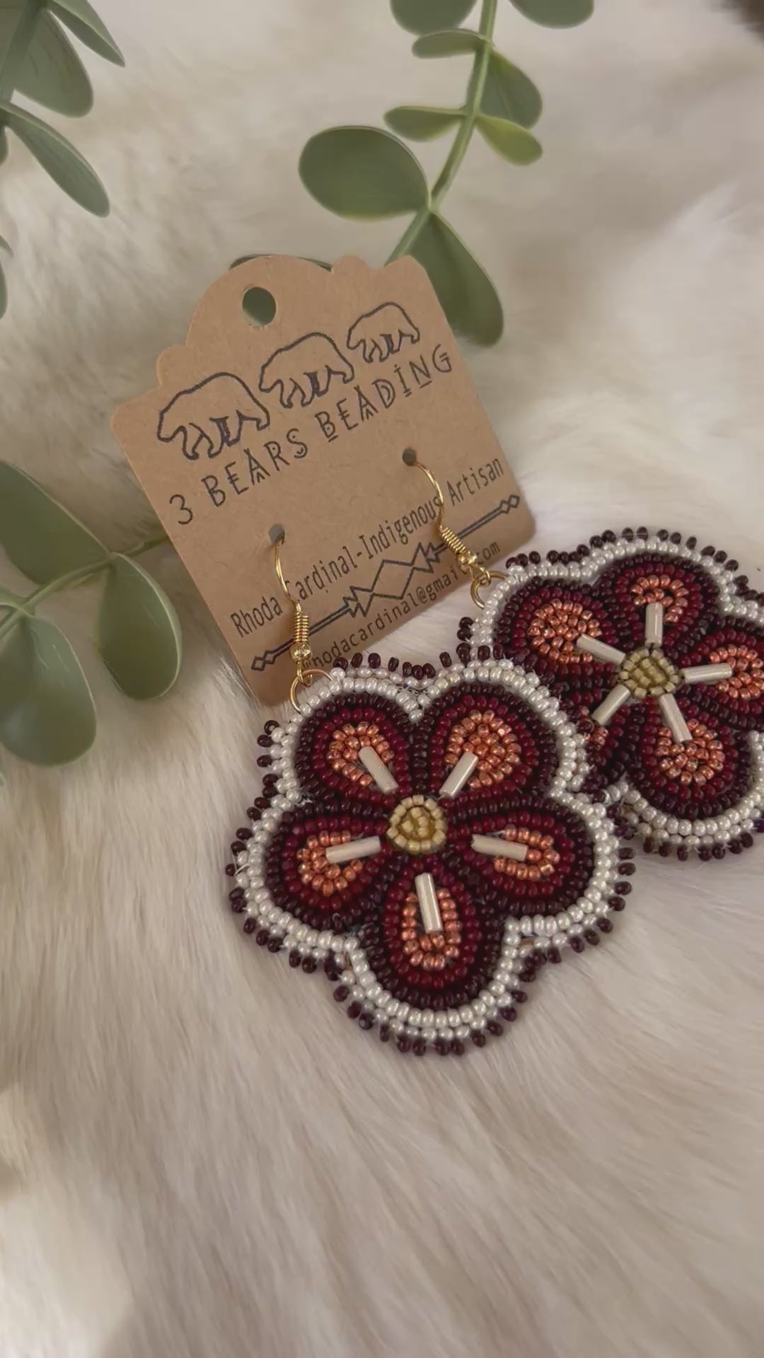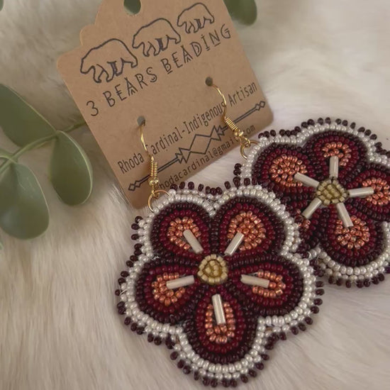 Elevate your style with these elegant brown and cream beaded earrings, expertly handcrafted and finished with a soft moose hide backing. Measuring just over 2.5 inches, they offer a distinctive and refined touch to any outfit.