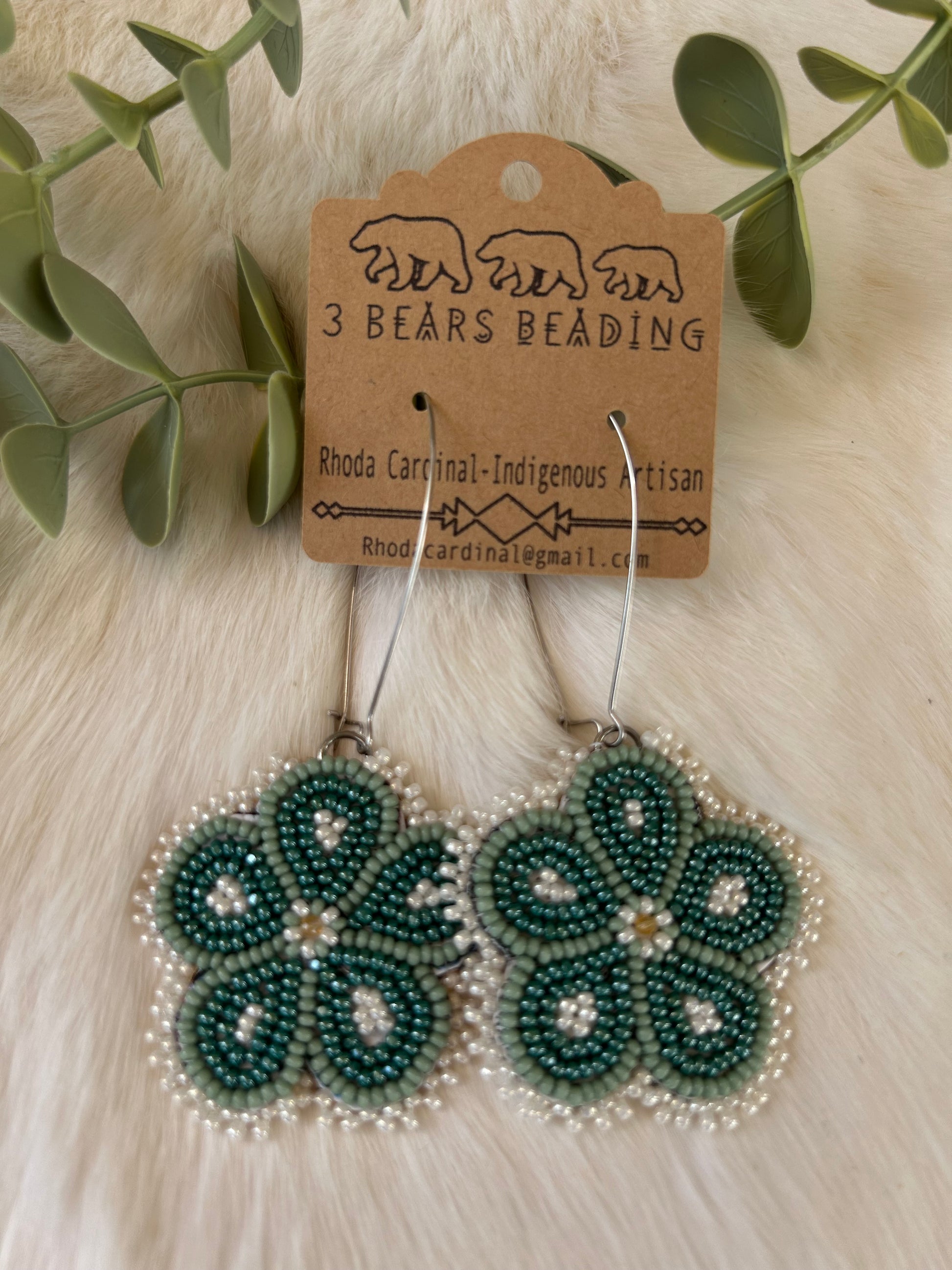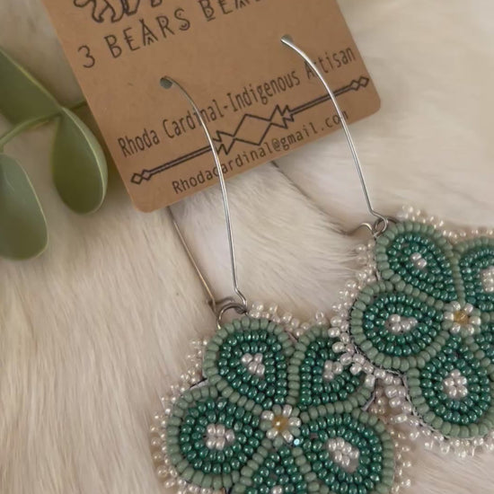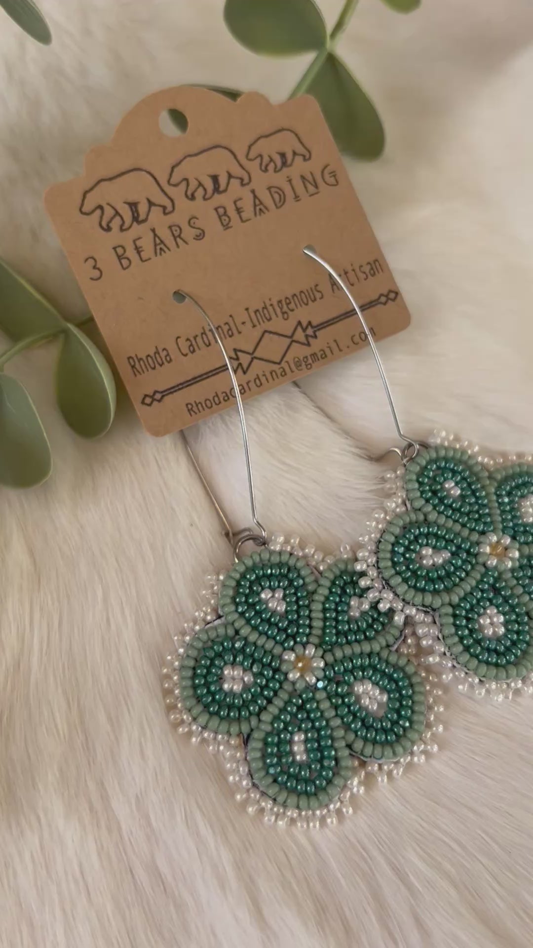 Experience the beauty of tradition with these green floral beaded earrings, expertly crafted to showcase delicate beadwork in an elegant floral design. Their subtle dangle adds graceful movement, while the soft moose hide backing offers lasting comfort and durability. Measuring just over 2 inches, these earrings strike the perfect balance for making a refined statement. Embrace Indigenous craftsmanship and elevate any outfit with a meaningful touch of cultural artistry—these earrings are a must-have addition to your collection.